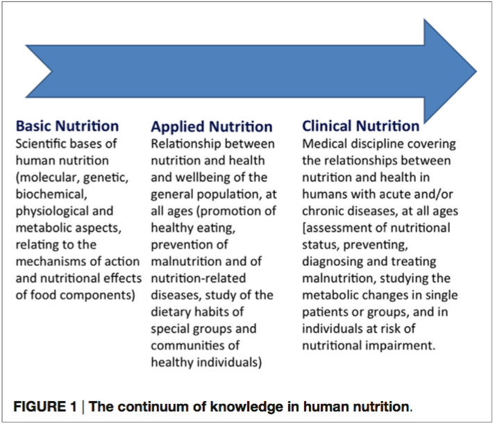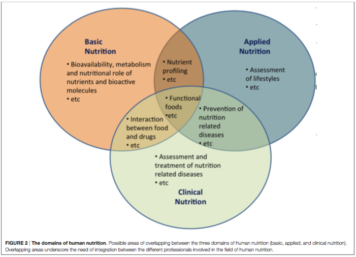 Federation of the Italian Nutrition Societies has identi ed three main domains of human nutrition, namely, basic nutrition, applied nutrition, and clinical nutrition. ese three domains have their own cultural and scienti c identity, speci c aims, and are clearly corresponding to professional skills. On the other hand, while being distinguished, these three domains are and must be closely connected and integrated both for academic training and professional activity (Figure 2).