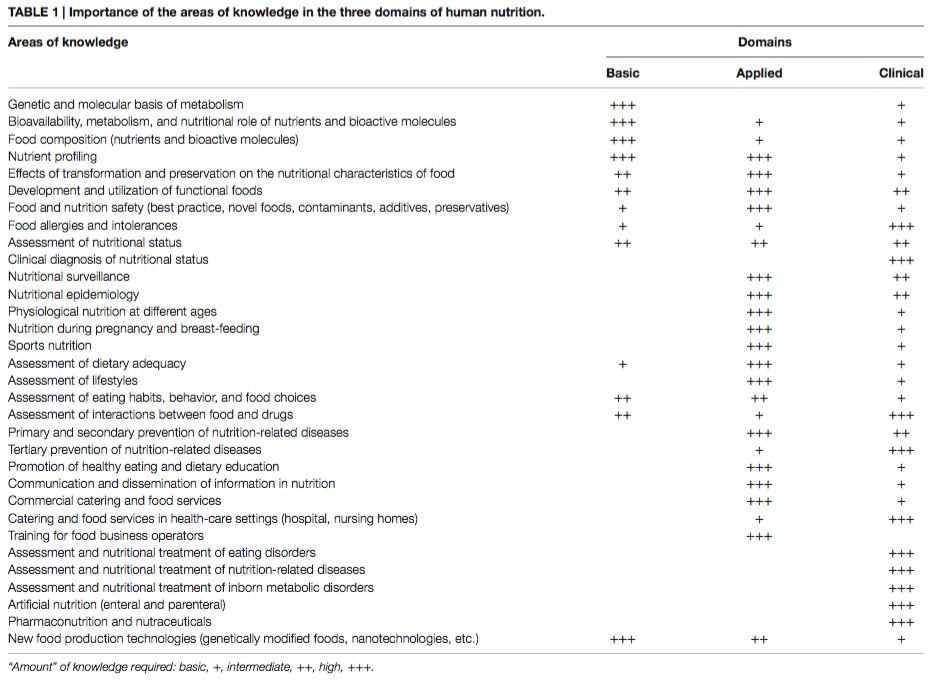 Three main domains of human nutrition, namely, basic nutrition, applied nutrition, and clinical nutrition, were identi ed. FeSIN has examined the areas of knowledge pertinent to human nutrition. Thirty-two items were identi ed, attributed to one or more of the three domains and ranked considering their diverse importance for academic training in the different domains of human nutrition. Finally, the study group proposed the attribution of the different areas of knowledge to the degree courses where training in human nutrition is deemed necessary (e.g., schools of medicine, biology, nursing, etc.). It is conceivable that, in the near future, a better integration of the professionals involved in the eld of human nutrition will eventually occur based on the progressive consolidation of knowl- edge, competence, and skills in the different areas and domains of this discipline.
