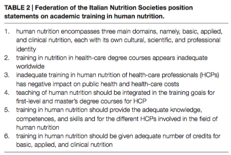 In view of the various objective critical points and lack of clarity on this topic, FeSIN has issued the present position paper setting out a series of criteria and guiding concepts in the attempt to improve academic training in human nutrition. Considering the vastity of this broad and multidisciplinary matter, the work- ing group concentrated on the identi cation and de nition of human nutrition domains and on the analysis of the areas of knowledge that could be attributed to basic, applied, and clinical nutrition, respectively. e list of areas of knowledge and the rank attributed to the di erent areas of knowldege are the result of a discussion between experts of di erent backgrounds and resulting in di erent sensibility. is may account for some di erence in judgment and opinion on individual aspects of human nutrition. is position paper also o ers a rst step toward a better organization academic training in postgradu- ate courses like Master and Residency courses (see details in Supplementary Material). e relevant issue of the low “nutritional culture” linked in particular to an insu cient academic training for HCPs has been long described. In di erent studies, most of resident physicians and general practitioners consider themselves not adequately trained to provide nutrition counseling (23, 24). ese gaps in knowledge were found to be positively correlated with the level of education the physicians received and self-perceived educa- tion was found to be associated with higher levels of knowledge(25). Although 98% of medical schools in the US reports nutri- tion as a component of medical education, in fact a nutrition curriculum is not identi able in most schools while the e ect on clinical skills in medical schools that do include nutrition has not been evaluated (26). e compelling need to improve nutritional knowledge and skills among HCP is substantiated by a number of studies. Friedman and colleagues (27) indicated that the “mission to increase the number of physician nutrition experts at the undergraduate and postgraduate levels requires an analysis of the current status of nutrition education in U.S. medical schools.” Moreover “a survey of past e orts at solving the problem of teaching the essentials of nutrition to medical students, and recommendations aimed at initiating helpful short- and long-term programs to create greater numbers of physician nutrition experts” is deemed necessary. e authors also wisely highlight the necessity to integrate courses both horizontally and vertically, connecting the basic sciences and clinical medicine. ey nally proposed short- and long-term recommendations. In particular, they advise that a 1-year course emphasizing “essentials of nutrition” should be o ered nationwide to committed individuals among all specialties and that nutrition topics should be progressively introduced in academic training.
